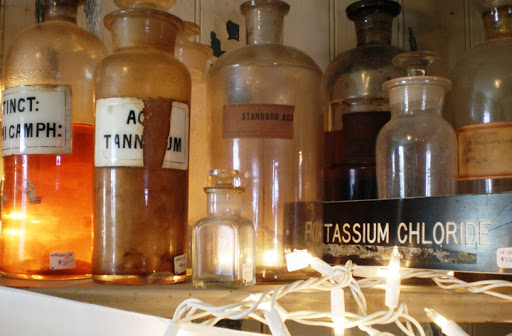 vintage lab bottles line a shelf.