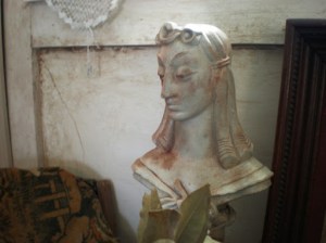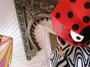 umbrellas co-exist with architectural salvage.