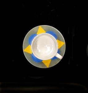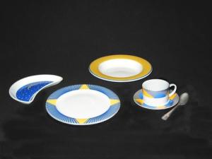 It was a new pattern of china, reflecting the curve of the earth that you could see from that height, the sun rising and setting, the blue and white and yellow of the sky, stars and the moon at night. These are reflected in the coffee cup, the saucer, the dessert plate, the silverware. He also had one of the private label champagne bottles full still in his freezer and a champagne glass.”
