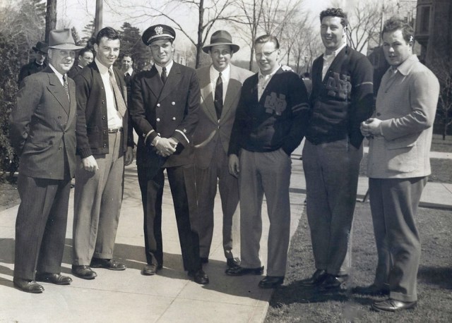 His roommate, Johnny Lujack, Heisman winner with movie star good looks, third from left.