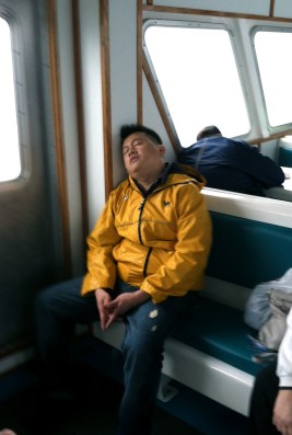 We started to hit some huge swells. It was like being on a plane in turbulence, but without the low ceiling. On a plane, we’d concuss. This was more like a carnival ride. The little kids behind us were screaming with laughter. Out the window it looked like the world’s bumpiest car wash.
