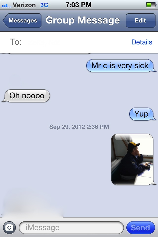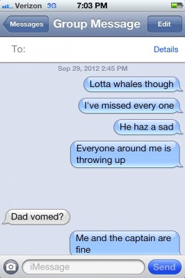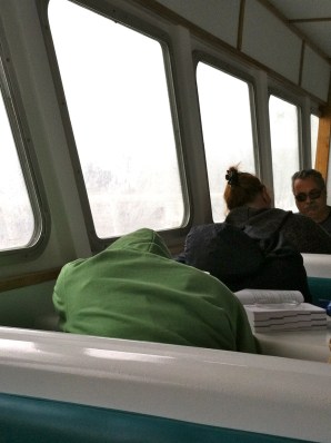 “Ha. We did that in Maine a few years ago. Same thing…everyone was feeling sick. And we had to LISTEN for the whales because we were in a wall of thick fog once we got a mile or two off shore. Poor Cuddy…we weren’t quite that bad.”
