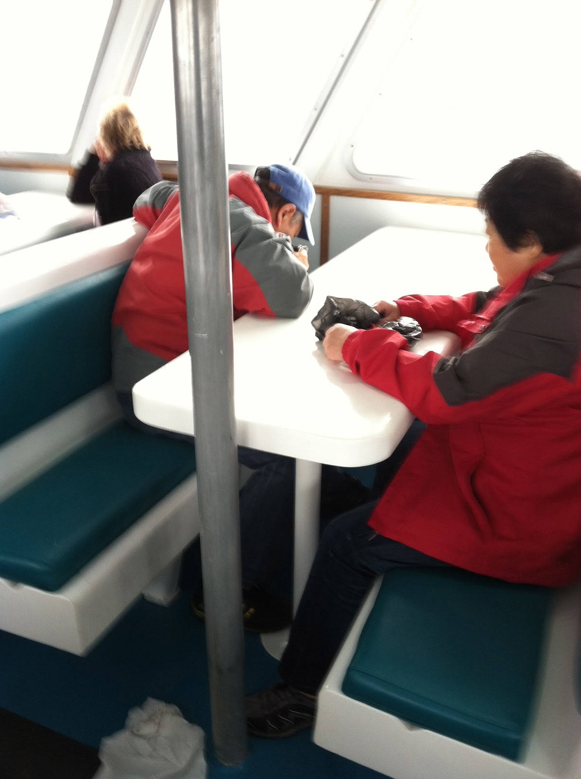 We took a seat at the back of the boat. It was less crowded there and we had an unobstructed view. To our left, we saw a seal diving in the water. Cool. We slowly made our way out to sea. The video camera guy came by and said he’d be offering a commemorative video after the trip. He thought his great shot of Cuddy waving would make it a winner for sure. It started to get chilly, so we moved inside.